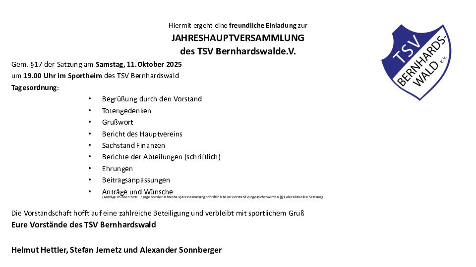 Einladung zur JAHRESHAUPTVERSAMMLUNG des TSV Bernhardswald e.V.